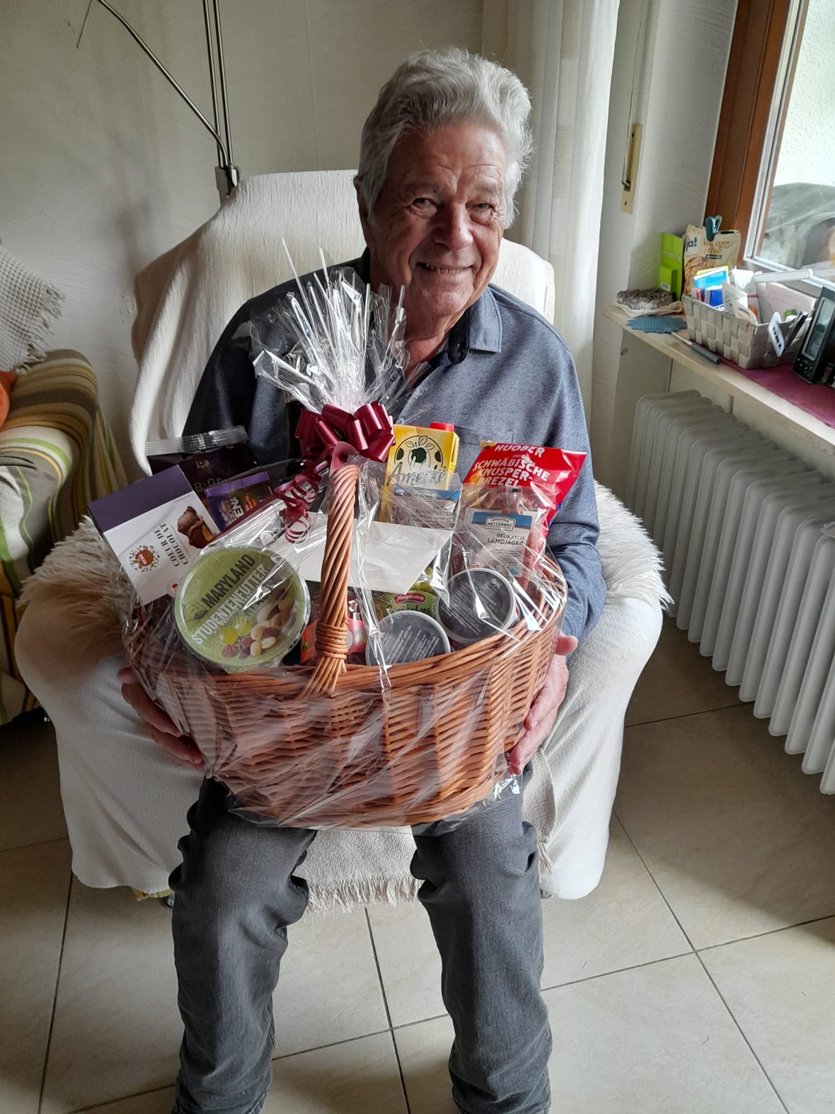 Georg Osdarty mit Geschenkkorb, der vom Vereinsvorstand überreicht wurde